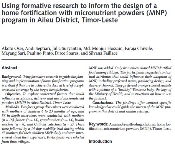 From July to August 2011, translated 1338 pages of Formative Research on the Acceptability, Promotion and Utilization of Micronutrient Powders (MNP) as part of Infant and Young Child Feeding (IYCF) strategy to improve the quality of complementary foods in Laulara sub-district, Aileu district of Timor-Leste. This document was given by Helen Keller International (HKI) Indonesia and translated from Tetum, local dialect and Bahasa Indonesia into English.