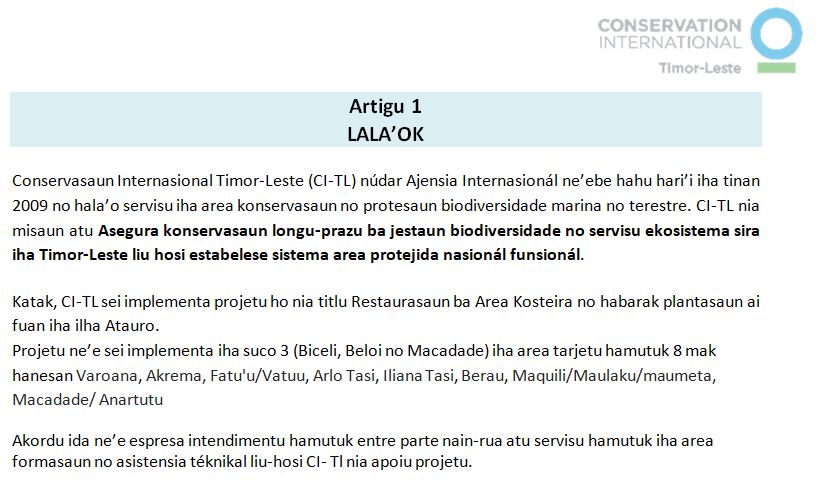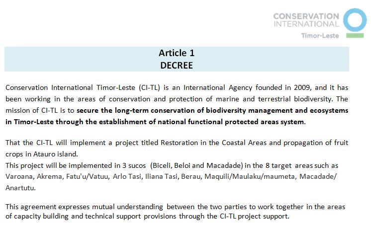 November 23, 2020 – With OASIS, translated from Tetum to English an agreement between the Conservation International Timor-Leste and Grupu Konservasaun Komunitaria (Community Conservation Group) for the Implementation of project of coastal areas restoration and the propagation of fruit crops in Atauro.